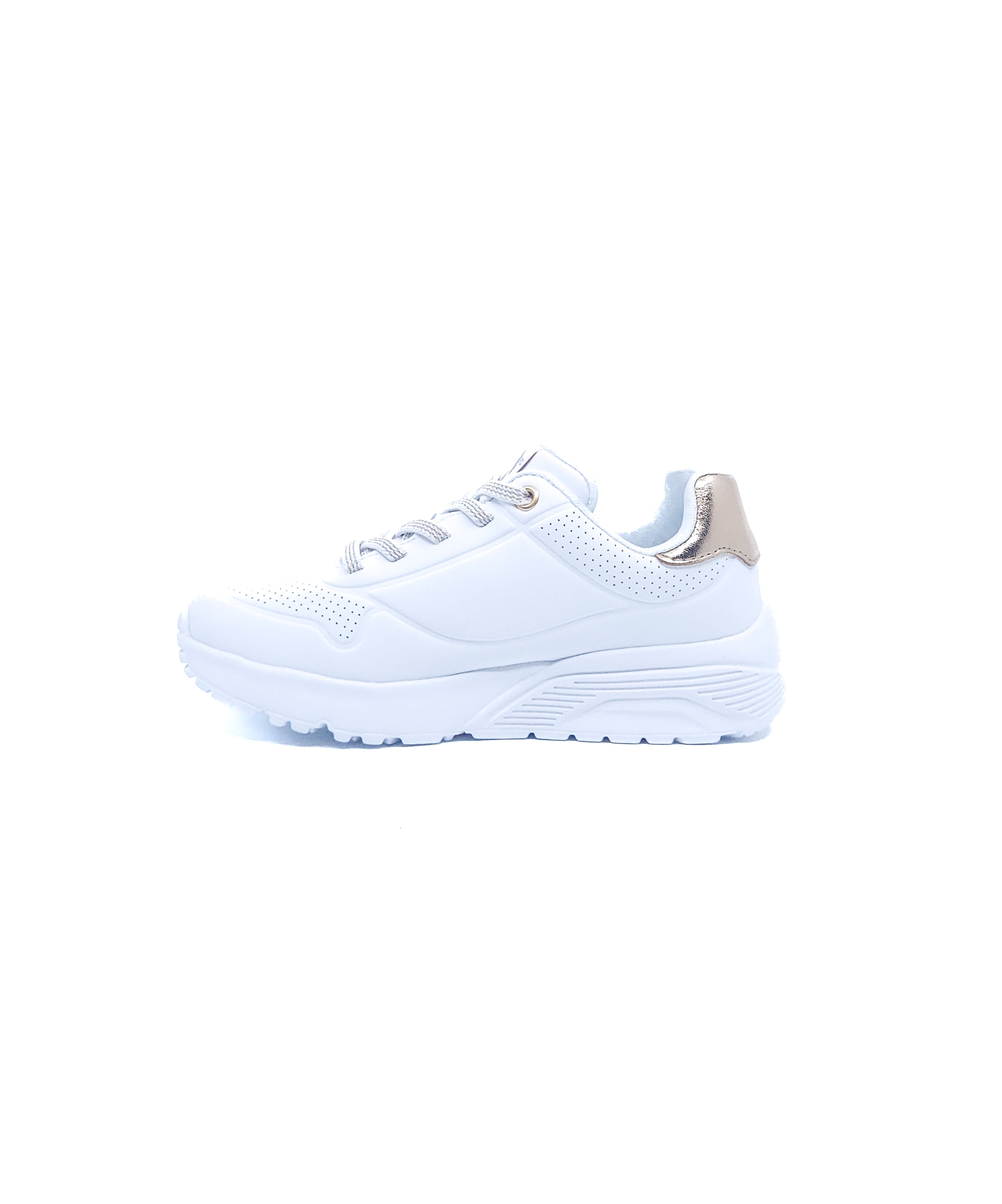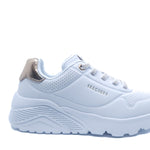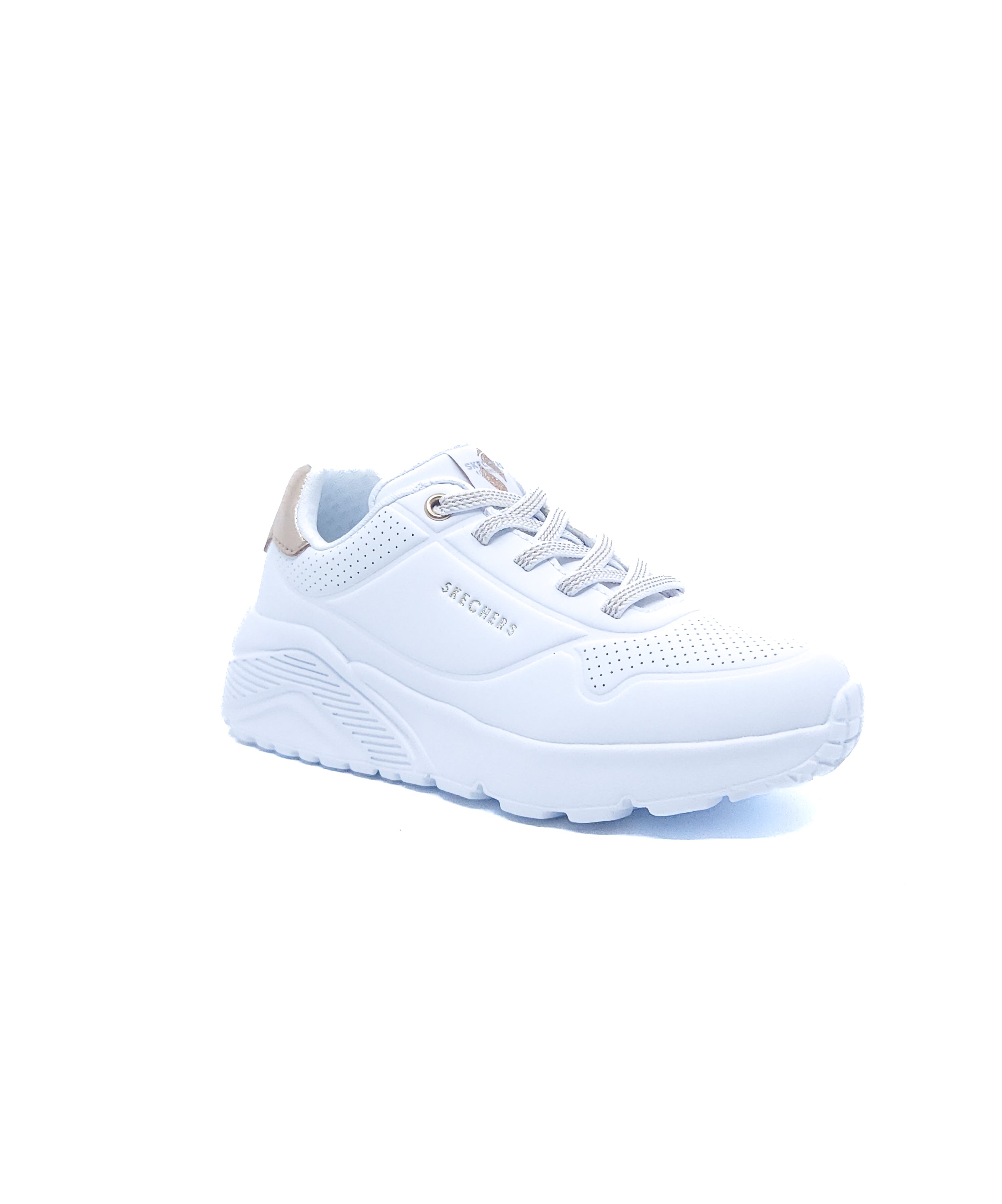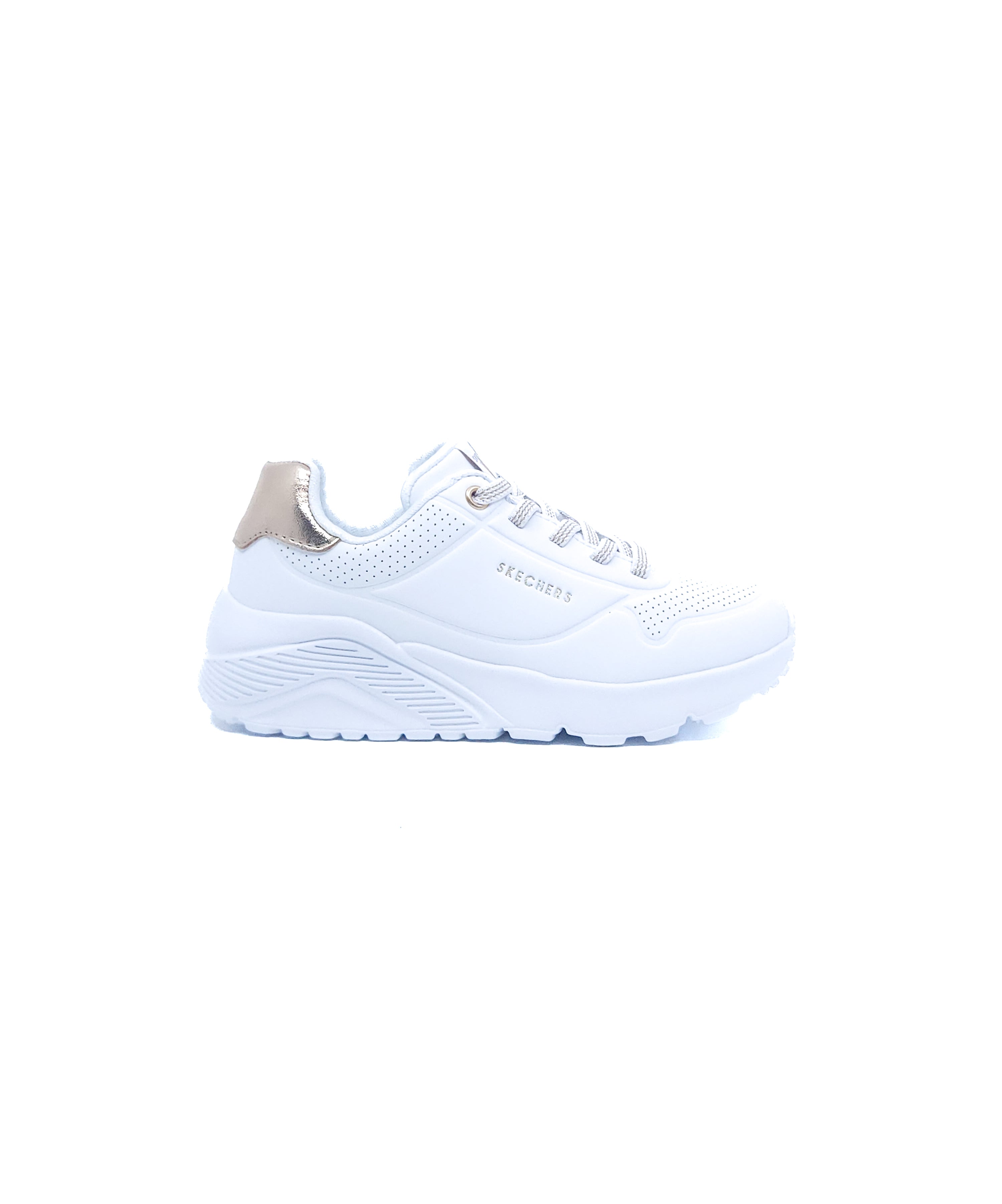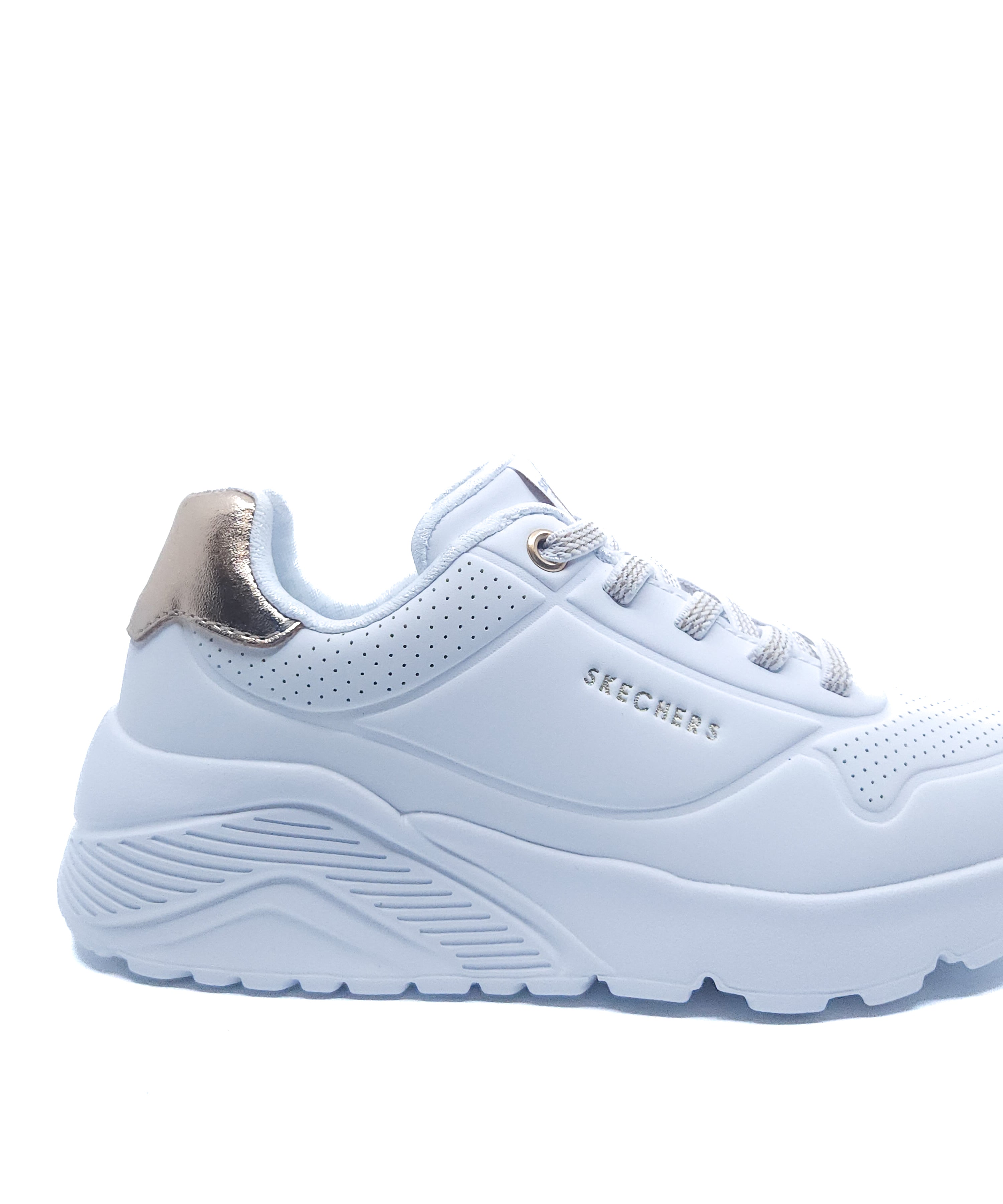 Aumenta o nível das tuas sapatilhas com o conforto almofadado das Skechers Street™ Uno Lite. Esta sapatilha moderna com atacadores elásticos apresenta uma parte superior em durabuck sintético com acabamento metálico, Skechers Adaptive Closure, palmilha Skechers Air-Cooled Memory Foam® e uma entressola de amortecimento para as plataformas de cunha.