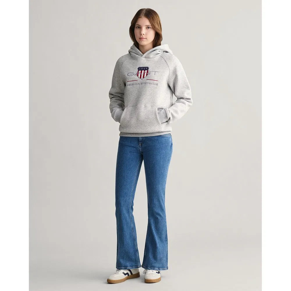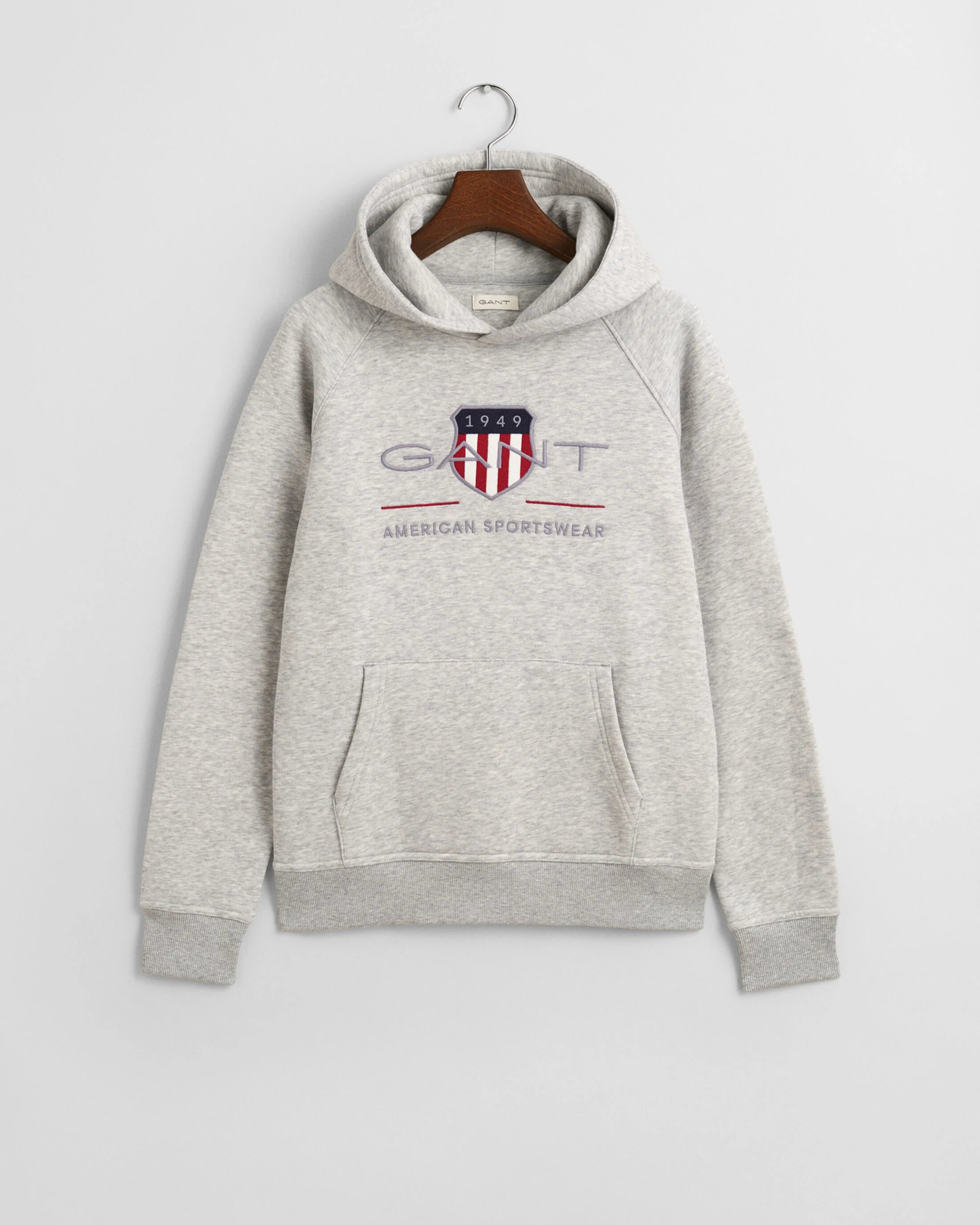 Feita numa mistura de poliéster rica em algodão, esta sweatshirt com capuz unissexo para adolescente está bordada com o nosso icónico grafismo Archive Shield. Uma peça essencial do American Sportswear, possui um bolso canguru e detalhes canelados nos punhos e bainha.