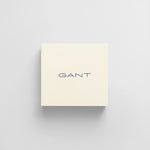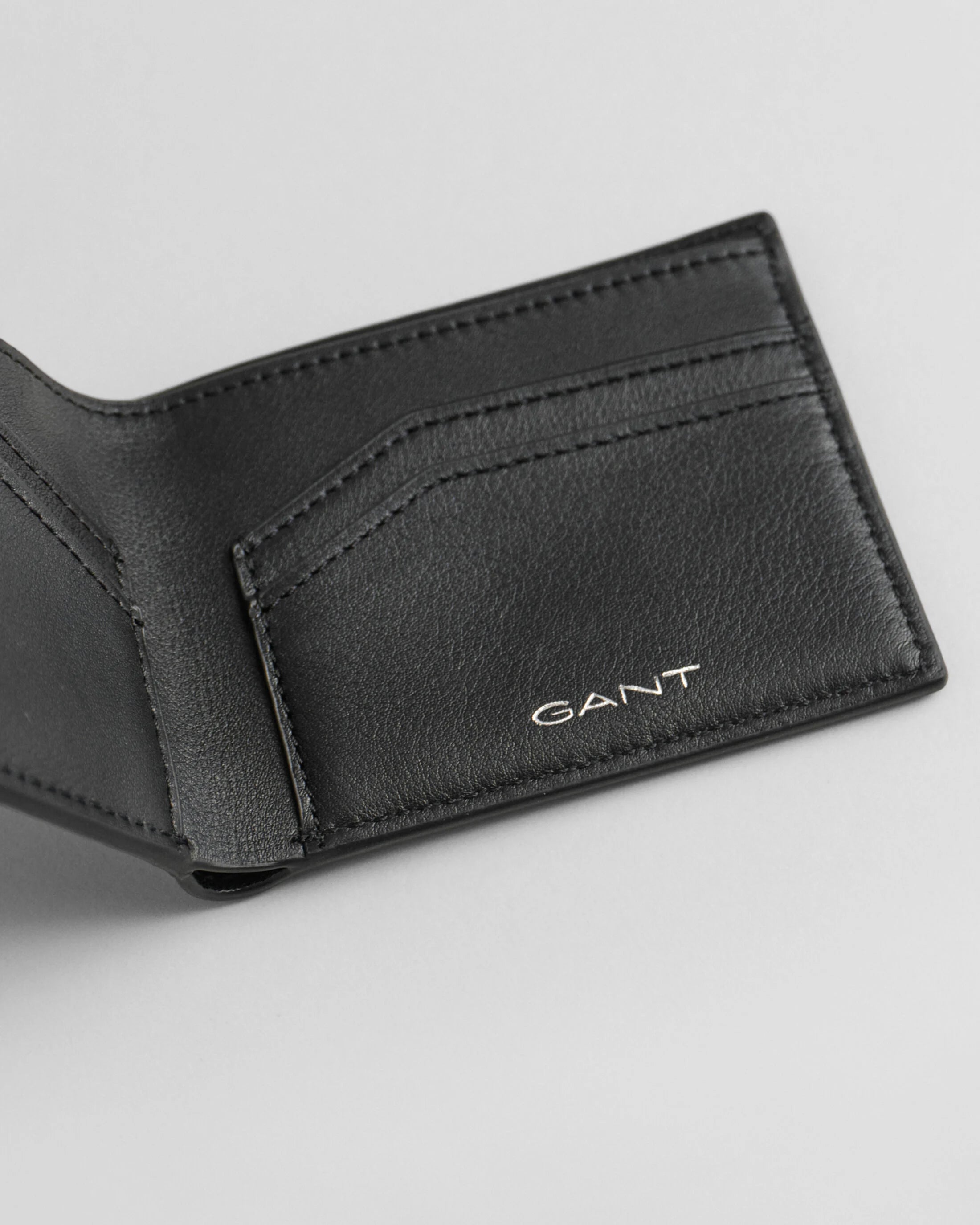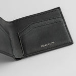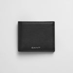 Uma carteira premium dobrável, confeccionada em 100% couro. Este modelo apresenta compartimentos para moedas e cartões, além do logotipo GANT em relevo prateado na parte interna e frontal da carteira.