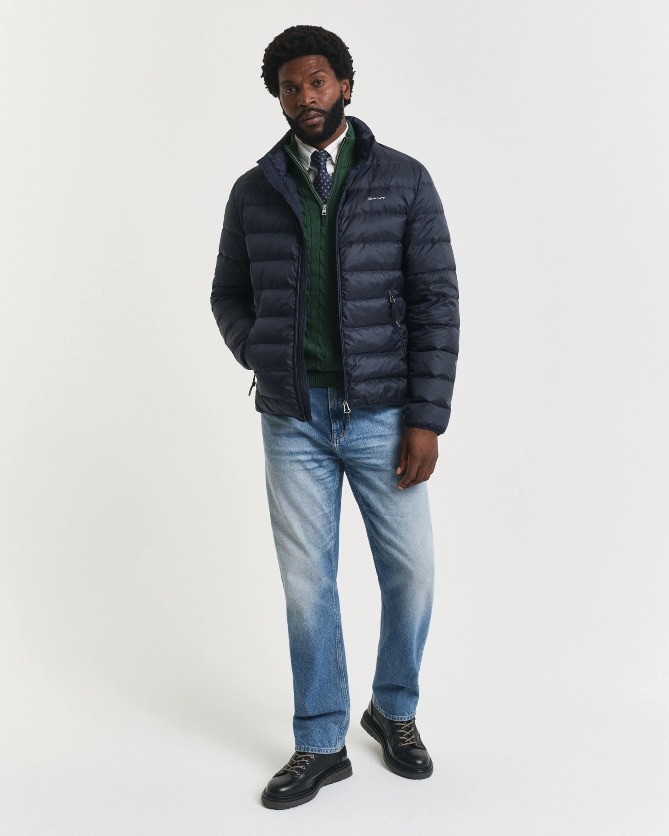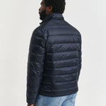 Uma peça simples para usar em camadas durante todo o ano feita com 90% de penugem e 10% de penas, este blusão de penas leve foi concebido em poliéster reciclado certificado e extremamente leve com um acabamento repelente de água. Esta peça tem um corte normal e um comprimento acima da anca, sendo ideal para usar isoladamente, por cima de camisas ou por baixo de sobretudos mais pesados nos dias mais frios. O colarinho subido, o fecho de correr de sentido duplo, os bolsos laterais e o emblema em borracha no peito completam a peça. Este blusão apresenta um tratamento repelente de água duradouro (DWR) que ajuda a repelir a água em condições meteorológicas leves. Apresenta um poder de enchimento de penugem de 650 e um isolamento leve.